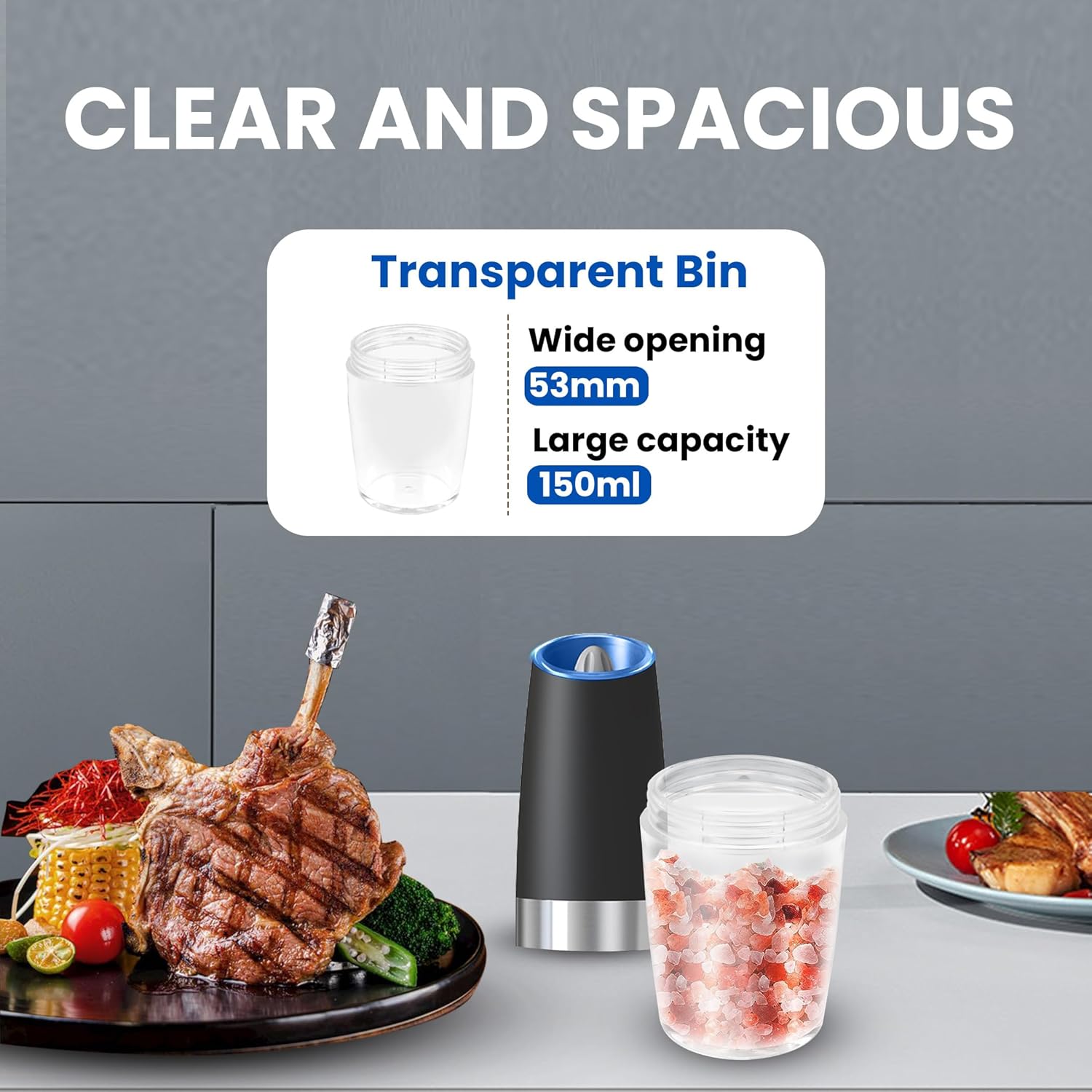 Estoremax Gravity Electric Salt and Pepper Grinder set of 2, Automatic Salt And Pepper Grinder Set, Adjustable Roughness, Battery Powered, LED Light,