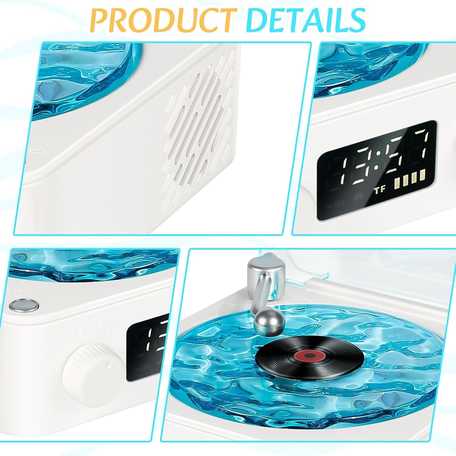 Estoremax Retro-Style Wireless Waves Vinyl Bluetooth Speaker, Aqua Vinyl Speaker, The Waves Vinyl Player with Ambience Light and Clock for Bedroom, Office, Party, White